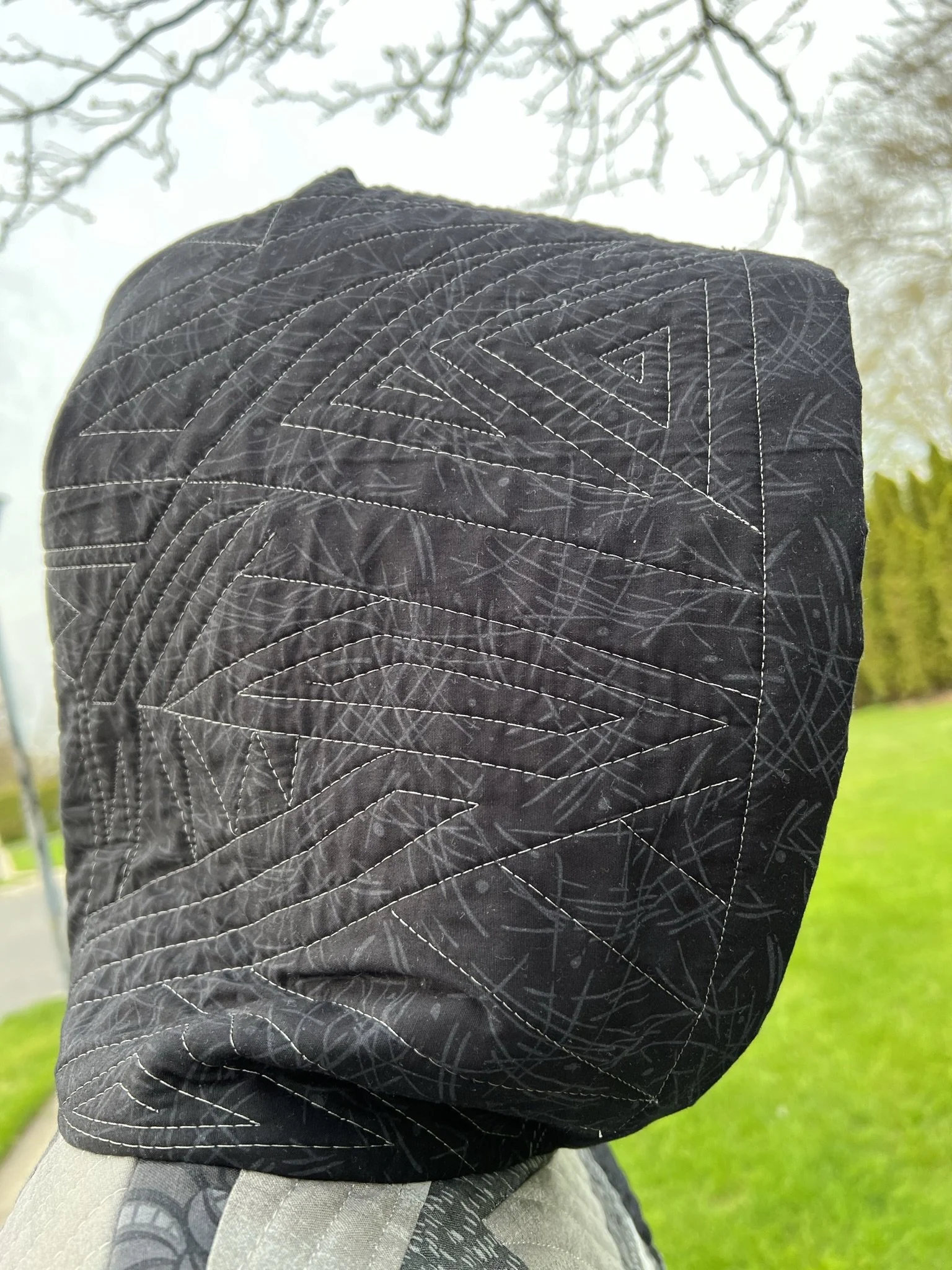 Top to bottom custom made sweater type hoodie. All parts are straight ruler work quilted, yes, including the hoodie. Assorted triangle shapes all over in monochrome. Best part of this is ~ it’s REVERSIBLE!! More images located at the gallery page.